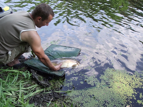 Godziny upływały dość szybko i w końcu mój sygnalizator pięknie zagrał! Odjazd był błyskawiczny, po niedługim holu na macie wylądował mój pierwszy karp z tej wody! Był okrągły jak piłka, nieduży ale piękny, sprawił ogromna radość, to był ciężko „wypracowany” karp, branie nastąpiło z pierwszego miejsca, na skraju grążeli.