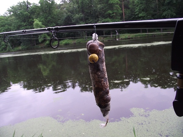 W drugim miejscu pod grążelami zanętę w postaci pokruszonych kulek, peletu i kukurydzy rozproszyłem na większej przestrzeni, na zestaw poszedł woreczek PVA wypełniony peletem zalanym liquidem a na włos neutralna kuleczka squida.