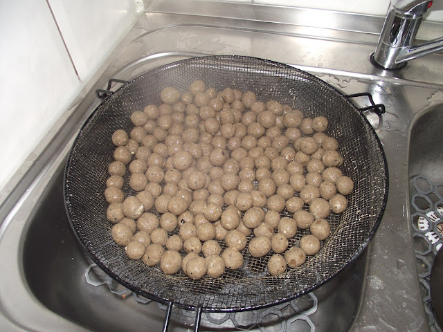 Tak wyrobione ciasto odkładamy zawinięte w worek do lodówki na ok 20 minut aby składniki się związały, po czym używając maszynki do mięsa lub specjalnego pistoletu do tego przeznaczonego, wyciskamy wałki, następnie rolujemy przy pomocy rollera do kulek, wielkość kulek zależeć będzie od średnicy rollera, oczywiśćie wielkość wałka dopasowujemy do rollera.