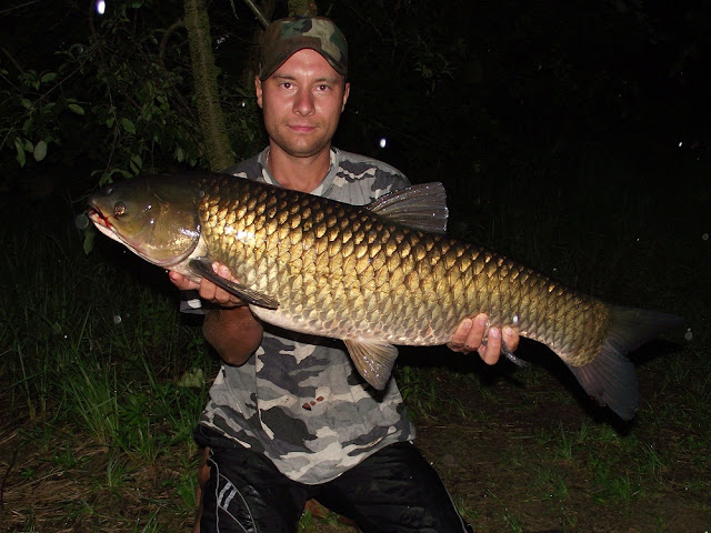 W nocy przeszła burza, po burzy jeszcze trochę padało więc noc spędziłem szczelnie pozamykany w namiocie. Ok godziny 4 usłyszałem pisk sygnalizatora, szybki odjazd, wyskoczyłem z namiotu - branie na wędce gdzie zestaw leżał bezpośrednio w szuwarach. Nie było wyjścia i trzeba było wypływać, ryba odrazy wplątała się we wszystko co po drodze rosło w wodzie:) hol nie należy do łatwych kiedy w jednej ręce trzyma się wędkę w drugiej wiosło i jeszcze trzeba rozplątywać żyłkę z roślinności, a w dodatku padał deszcz, ale udało się, powoli podciągnąłem rybę do brzegu i pierwszy w tym sezonie amur wylądował na macie!