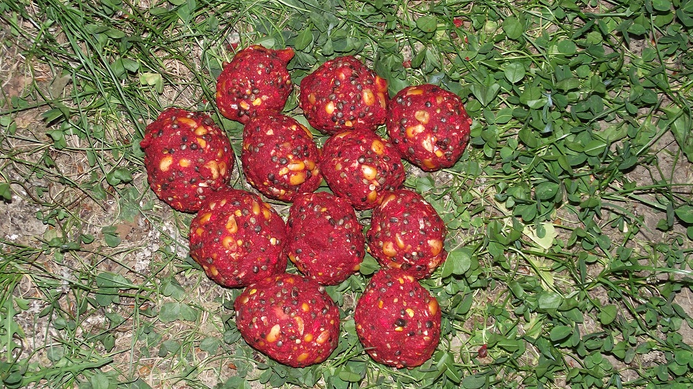 Wieczorem postanowiłem donęcić miejsce gdzie spodziewałem się amura, rozrobiłem pół kilo truskawkowej gruboziarnistej zanęty dodałem trochę kukurydzy, wszystko to zalałem truskawkowym bosterem, robiąc z tego niezłą truskawkową bombę zapachową.