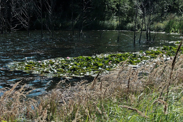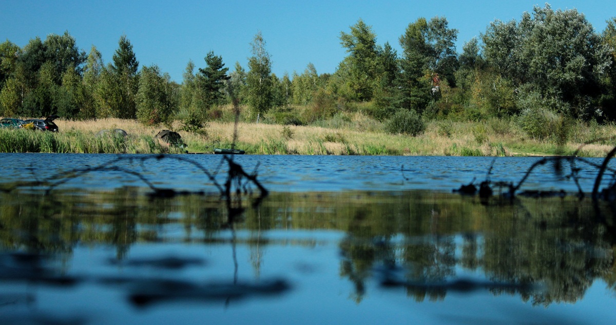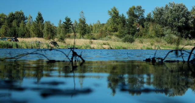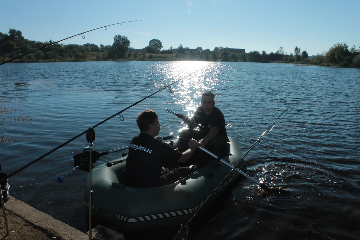 Na zbiorniku, dookoła linii brzegowej i na środku na zatopionym wale, pojawiło się sporo grążeli co dodatkowo uatrakcyjnia wodę, postanowiliśmy to wykorzystać i zestawy powędrowały właśnie pod grążele i na przeciwległy brzeg pod zatopione krzaki. Woda ta, choć pływa w niej sporo karpi i amurów, które co jakiś czas się spławiają nie należy do łatwych, jest kapryśna i wymagająca, ale właśnie takie wody lubię najbardziej. Sporo czasu poświęciłem na dokładne sprawdzenie dna echosondą i stukadełkiem, ponieważ na dnie na głębokości do ok 2,5 metra występuje moczarka i wywłócznik. Nie lubię łowić na dnie o którym nic nie wiem, przypadkowe położenie zestawu gdziekolwiek mija się z celem, więc zawsze badam dokładnie dno, dla rozeznania i wybrania najlepszego według moich teorii miejsca. Przejrzystość wody na Pogalewie pozwala na oglądanie pięknych rozległych podwodnych łąk co dodatkowo pobudza wyobraźnię. Są również czyste place i miejsca z miękkim i twardym dnem więc z wyborem odpowiedniej miejscówki nie było problemu. Koledzy z Teamu Łowisko Pogalewo łowili niedaleko nas, swoje zestawy położyli przy zalanych drzewach i pod przeciwległy brzeg co okazało się dobrym wyborem...