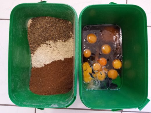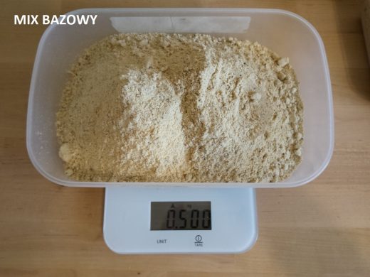 Nasze małe, tanie, domowe kulanie podzielimy na dwa etapy. Etap 1 – będzie to połączenie wszystkich składników tak, aby powstało z nich ciasto. Przy łączeniu składników pamiętamy o zasadzie: suche z suchymi, a mokre z mokrymi. W pierwszym pojemniku odmierzamy 500g mixu bazowego, 100 g mączki z kałamarnicy, 250 g mączki rybnej, 100 g bird foodu i 50 g mielonych konopi. Po odmierzeniu odpowiedniej ilości przesypujemy wszystko do jednego pojemnika.