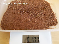Drugie przesypuję do plastikowego pojemnika, do którego nalewam niewielką ilość liquidu oraz wsypuję trochę mączki z kałamarnicy. Następnie dokładnie mieszam.