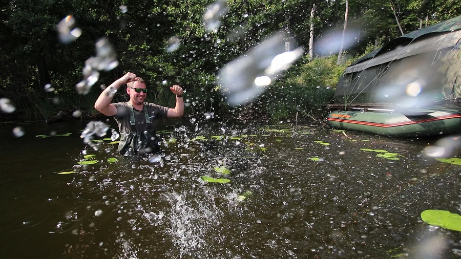 Szybka przeprawa na nasz pomost, na którym mieliśmy spędzić najbliższe 6 dni. Pierwszym charakterystycznym elementem dla zasiadek nad jeziorem Smolno jest możliwość noclegu w wielkim wojskowym namiocie, który ulokowany jest na drewnianej platformie. Muszę przyznać, że jest to bardzo przyjemna alternatywa do mojego standardowego namiotu karpiowego. Po wypakowaniu sprzętu z pontonów przyszedł czas na to co lubię najbardziej czyli poznawanie tego co znajduje się poniżej lustra wody. Wiedza, o tym z jakim dnem mamy do czynienia, jaką temperaturę ma obecnie woda, możliwość bezpośredniego zbadania miejsc położenia zestawów to jest to co zwyczajowo nazywam odkrywaniem wody. Jest to zdecydowanie najciekawszy i niepowtarzalny element każdej zasiadki. Ukształtowanie zbiornika pozwoliło nam na znalezienie kilkunastu potencjalnie idealnych miejsc żerowania karpi. Pomimo tego, że oboje mieliśmy do dyspozycji łącznie 6 wędek, nie było możliwości sprawdzenia każdej z nich, więc ja postawiłem na wizualnie idealną zatokę o głębokości około 3 metrów z twardym dnem, na którym znajdował się tylko lekki namułek. Kolejny zestaw powędrował w okolice zatopionego starego pomostu, o którego obecności świadczył tylko jeden pal wystający z wody. Ostatnie miejsce, w którym pokładałem największe nadzieje to kilka zwalonych po sobie drzew, między którymi porastały pojedyncze grążele, a przy głębokości około 1,5 metra na dnie było widać idealnie czyste place z piasku.