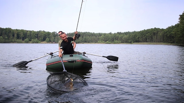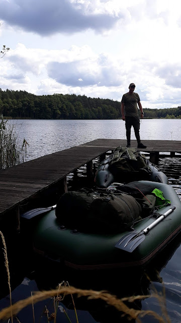 Przy pierwszym rzucie oka na wodę już było widać kilka idealnych miejsc, w których można by pokusić się o położenie zestawu. Wszelakiego rodzaju zatoczki utworzone z trzcinowisk, place grążeli, powalone drzewa, pozostałości po starych pomostach czy drzewa zwisające prosto nad lustrem wody.Po obejściu wody dookoła i wstępnym wyborze stanowiska wiedziałem już mniej więcej czego będę potrzebował, ponieważ właśnie sprzęt jest kolejnych elementem, którego nie mogę pominąć w planowaniu zasiadek. Dostęp do stanowiska możliwy jest tylko poprzez przeprawę. Na szczęście na miejscu gospodarz dysponuje łódką, którą mogliśmy przeprawić się wspólne z Przemkiem, natomiast nasze pontony mogły wystąpić w roli przyczep tragażowych. Zdecydowanie najwygodniejszym sposobem lokowania zestawów w tak trudnych technicznie miejscach jakie widzieliśmy jest punktowe położenie zestawu bezpośrednio z pontonu. Oczywiste jest, że przy braniu z takiego miejsca najwygodniejsze są krótkie wędziska, dlatego postanowiłem spakować miękkie 10 stopowe kije.